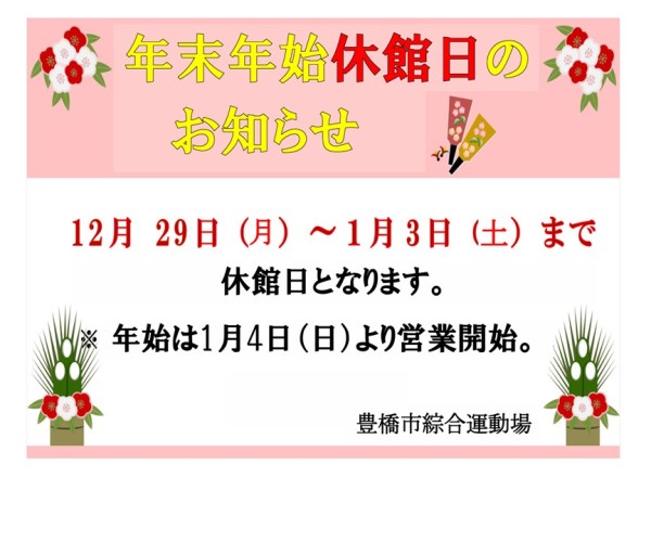 年末年始休館日、年始営業開始日のご案内です。